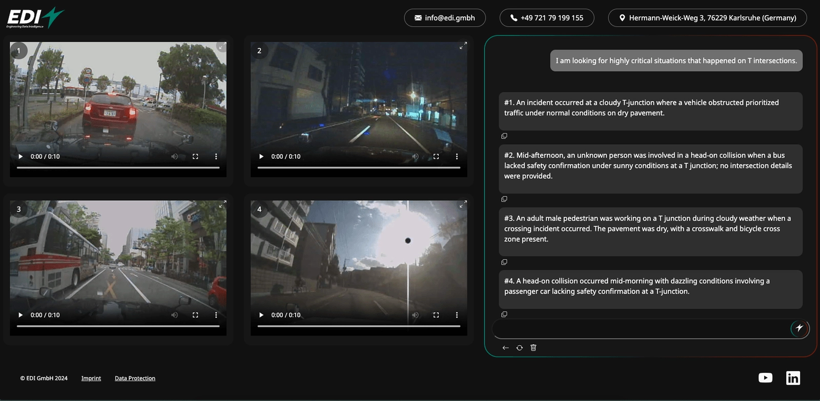 Szenariensuche in natürlicher Sprache: Formulieren Sie Suchanfragen wie „Welche Fahrszenarien beinhalten einen Fußgängerüberweg bei schlechtem Wetter?“ – die KI findet passende Fahrszenarien – inklusive Metadaten, Quellenangaben und Links zu Originaldaten und Videos.